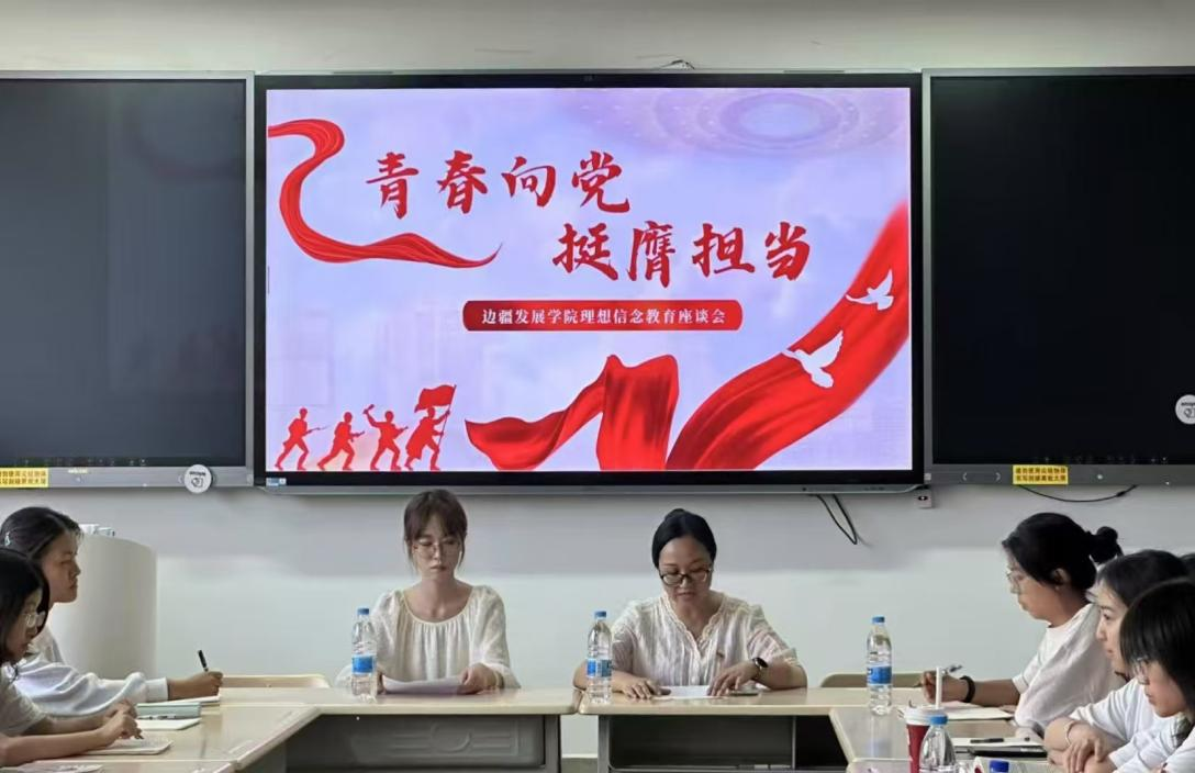 为深入学习贯彻习近平总书记给谢依特小学戍边支教西部计划志愿者服务队队员的回信精神,鼓励青年学子响应党的号召,为中国式现代化建设挺膺担当,5月21日,边疆发展学院学生会在302教室举行“青春向党 挺膺担当”理想信念教育座谈会,团学骨干代表和学生代表积极参会。