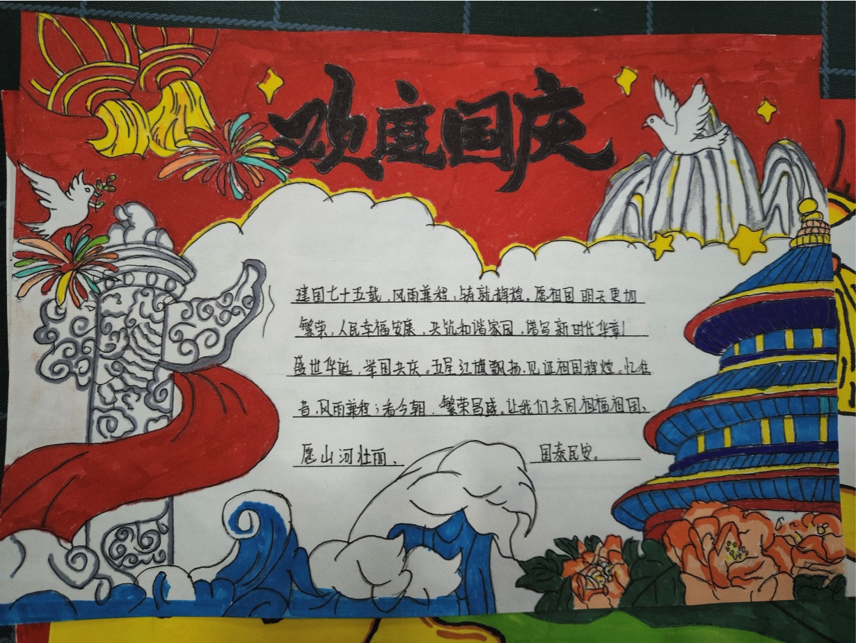 悠悠75载,风雨同舟;泱泱75载,铸就辉煌;浩浩75载,见证成长。同学们充分发挥自己的想象力和创造力,将自己心中对中国共产党的热爱和对祖国的祝福融入到作品中。作品完成后,同学们互相交流学习,分享创作的喜悦,并共同祝福祖国繁荣昌盛、国富民强。