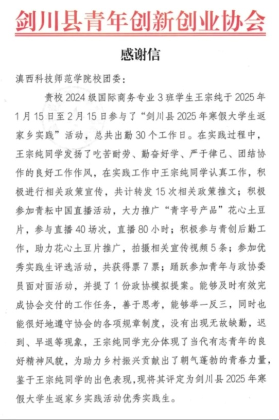 王宗纯,2024级国际商务三班学生,在“返家乡”社会实践活动中,在云南省大理州剑川县青年创新创业协会承担商务洽谈、电商直播、乡村调研及农产品推广等工作。在商务洽谈环节,他凭借扎实的专业基础和实践能力,系统梳理协会业务架构、合作模式及市场需求,在与企业对接过程中深刻领悟到商务沟通的艺术性与专业性。直播助农工作充满挑战与创新,为讲好剑川故事,他与队友们走访各乡镇,充分挖掘具有地域特色的非遗技艺与农特产品。这段实践经历使王宗纯实现了从知识接受者到价值创造者的蜕变。他不仅系统掌握了商务谈判策略、直播运营技巧等职业技能,更在与农户的深度接触中,深刻理解乡村振兴的内涵。“当看到阿婆们的手工绣品通过直播走出大山,那一刻真正体会到知识服务社会的价值。”他在实践报告中写道。
