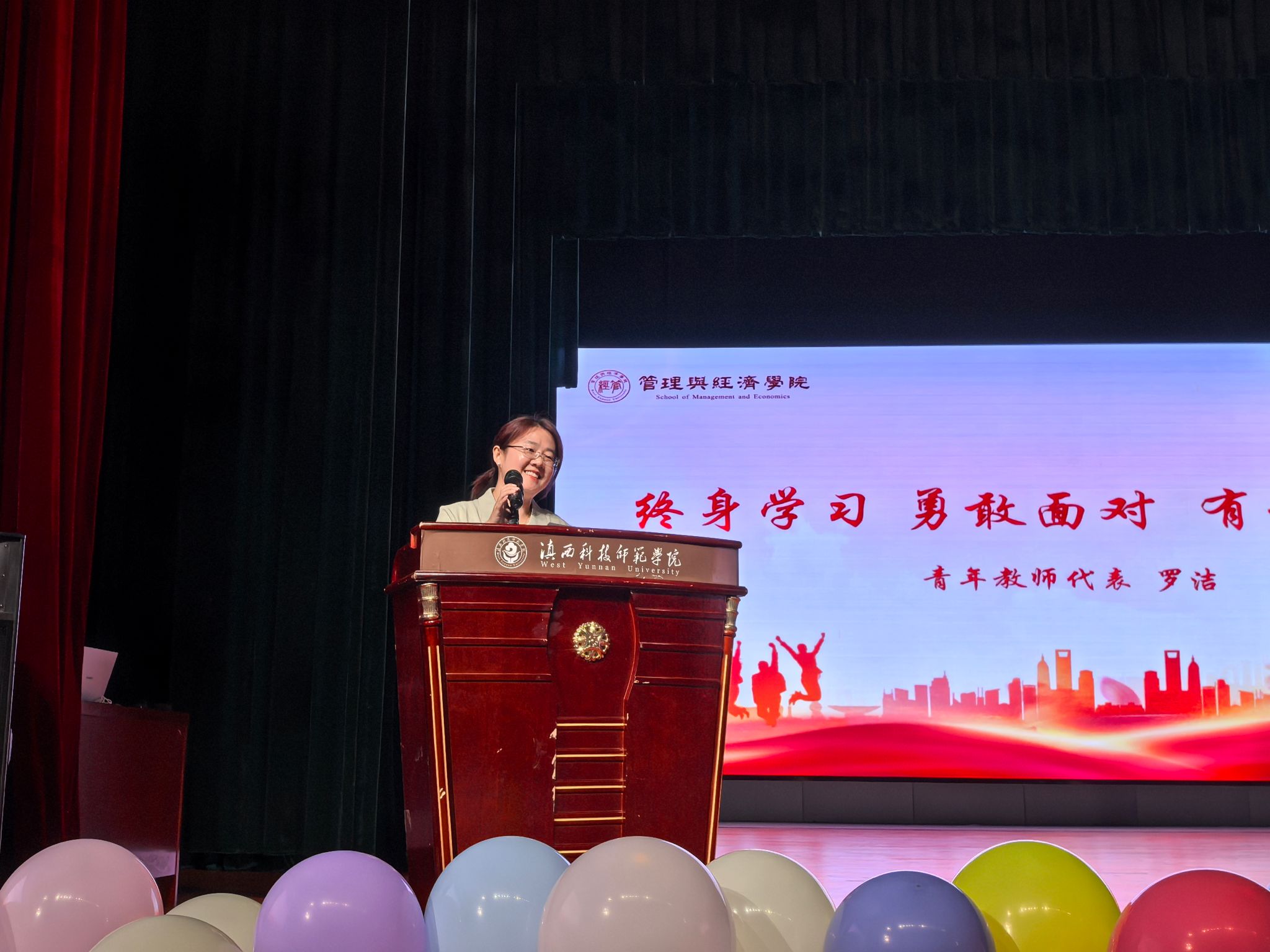 青年教师代表罗洁在发言中深情回顾了与毕业生们共同度过的美好时光,对即将开启新征程的学子们表达了诚挚希冀,并寄语毕业生们做有理想、敢担当、能吃苦、肯奋斗的新时代好青年,心存梦想,目有繁星,追光而遇,沐光而行。