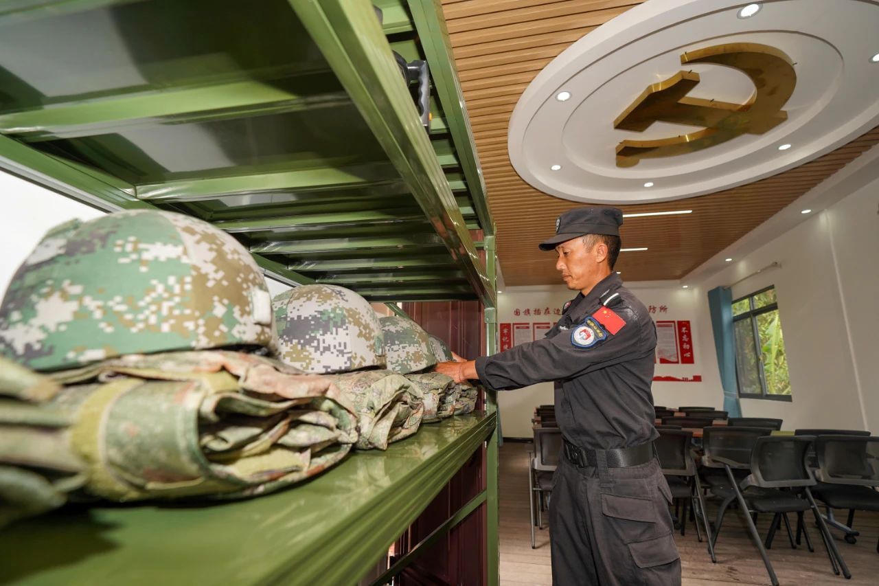 镇康县刺树丫口三级边境联防所联防队员在整理装备。(郝亚鑫摄)